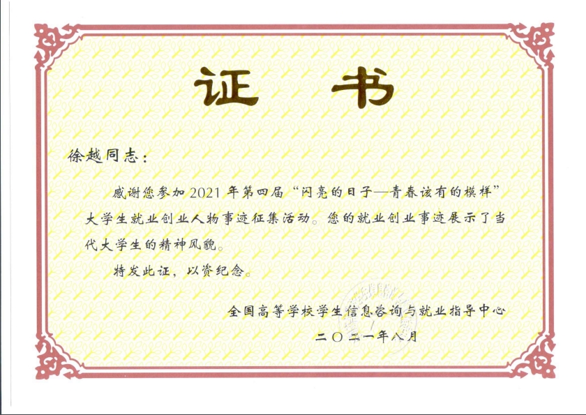 本次评选由教育部全国高等公司员工信息咨询与就业指导中心举办,经过公司初选申报、山东省教育厅复审推荐以及教育部遴选,公司选送的徐越同学在全省148名老员工就业创业人物事迹中脱颖而出,全省共有15名员工获此殊荣。据悉,入选的典型人物事迹将在全国高校员工信息咨询与就业指导中心官网专栏报道,在《中国老员工就业》杂志、新职业网、学信网、各省市就业指导中心网站刊发,并将出版发行。(通讯员:李雷 责编:徐展)