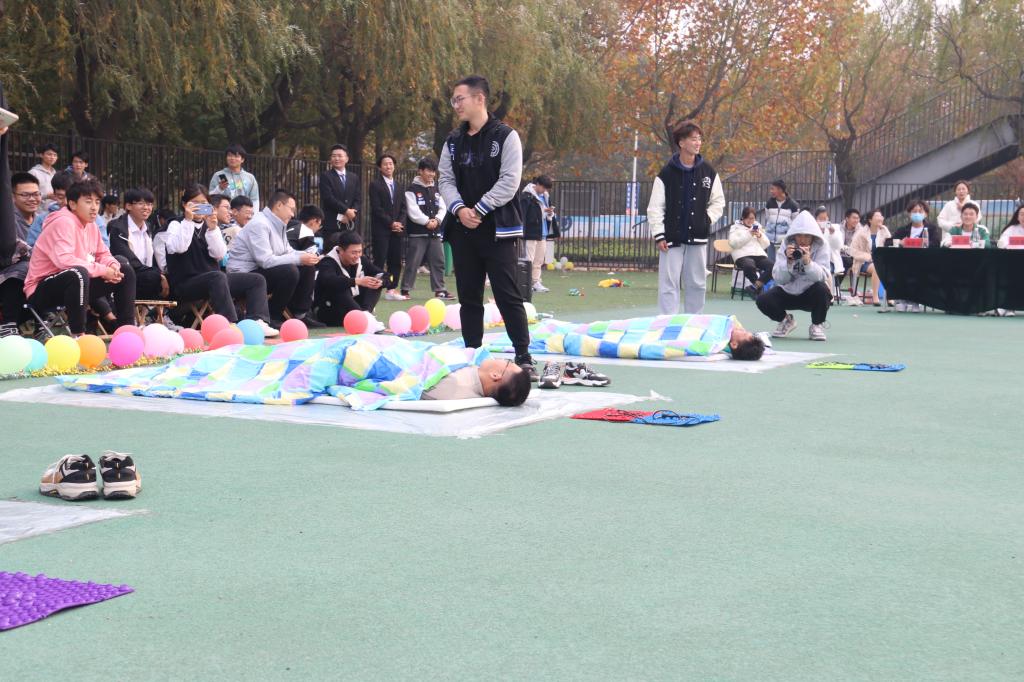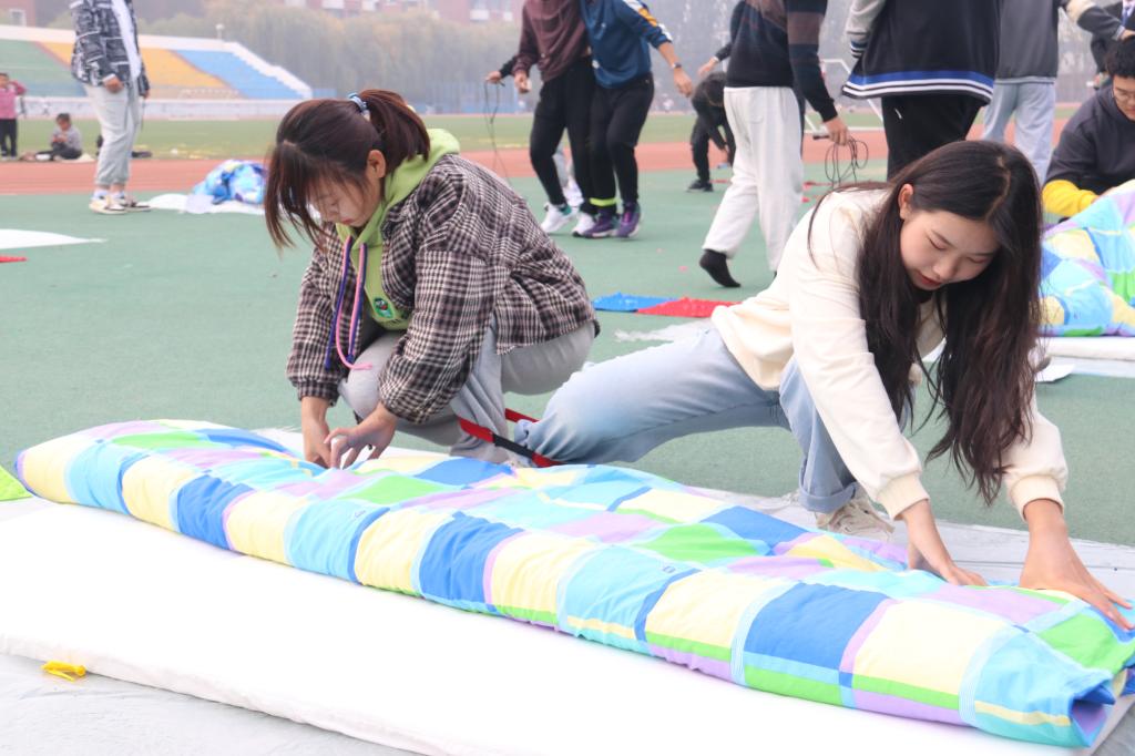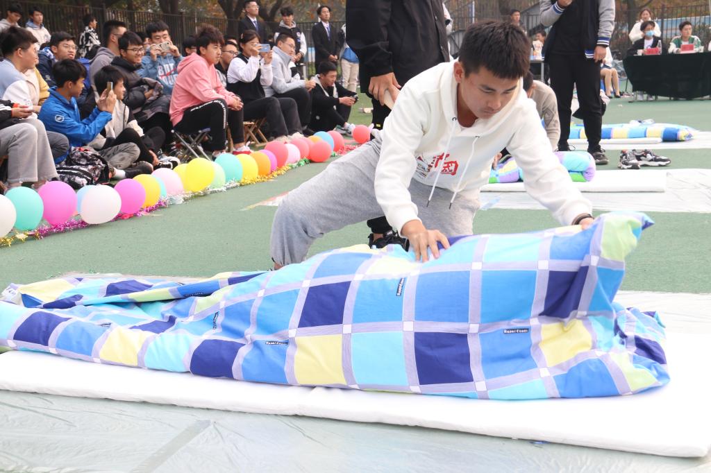 赛前,员工会两名文艺部干事带来的歌曲演唱节目活跃了现场气氛,拉开了比赛的序幕。此次军被大赛共有四个环节,分别是选手们从假寐中醒来,随着号声响起迅速叠被的“军号响起”、吹爆气球才能开始叠被的“气球大爆炸”、融合了两人三足与指压板跳绳等趣味游戏的“接力大作战”、需要全队齐心协力用小木棒传递胶带的“物资传递”,环节设计独具匠心。在计算最终成绩的等待时间,还举办了抢凳子的小游戏,现场观众们积极参与,气氛热烈。
