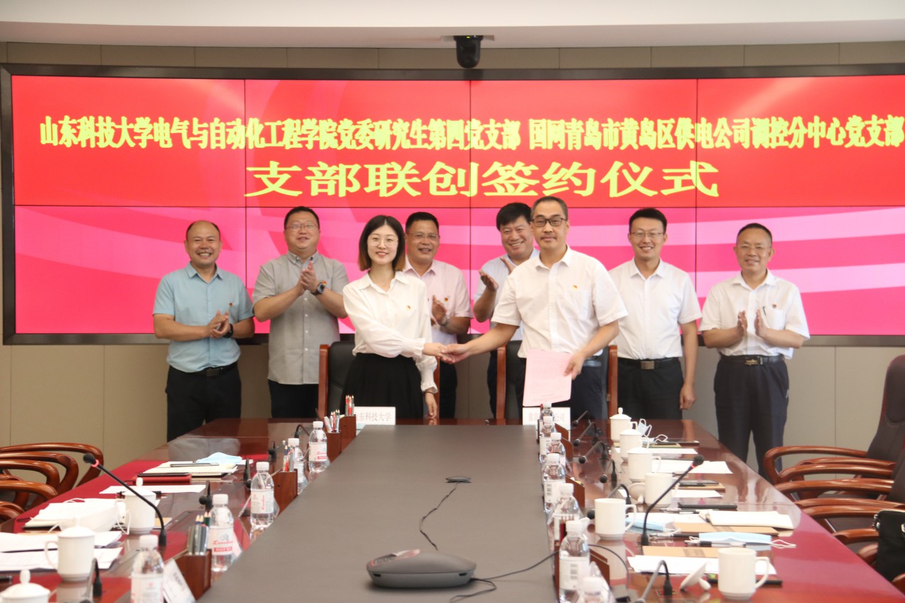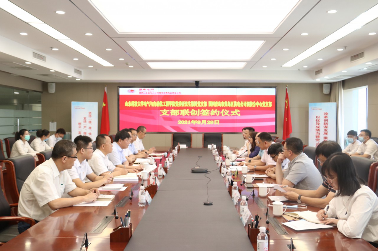 为深入学习贯彻习近平新时代中国特色社会主义思想,扎实推进党史学习教育,贯彻落实新时代党的建设总要求。经十大体育网站公司党委研究生第四党支部与国网青岛市黄岛区供电公司电力调度控制分中心党支部友好协商,决定建立长期、稳定的结对共建关系,开展多渠道、多层次、多形式的合作共建。9月29日上午,双方“结对共建”签约仪式在国网青岛市黄岛区供电公司举行。公司党委书记庄立臣,党委研究生工作部副部长刘松,国网青岛市黄岛区供电公司党委书记宋成清出席签约仪式,双方相关工作人员参加了签约仪式。